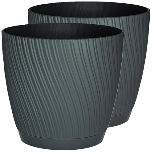 Home Garden Ornaments Plant Pots Indoor – Set of 2 with Drainage & Saucer Swing Indoor Plant Pot – Decorative Striped Flower Plastic Planter Design – 5 Colours & 6 Sizes (17cm 6.7 inch, Anthracite)
