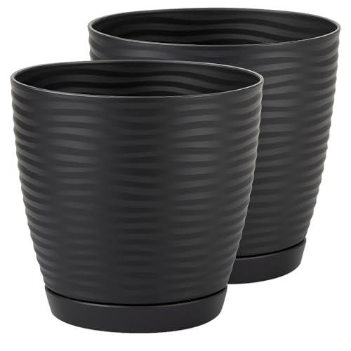 Home Garden Ornaments Plant Pots Indoor – Set of 2 Plastic Flower Pots with Saucer and Drainage Holes, Decorative 3D Wave Design (Black, 17cm / 6.7 inch)
