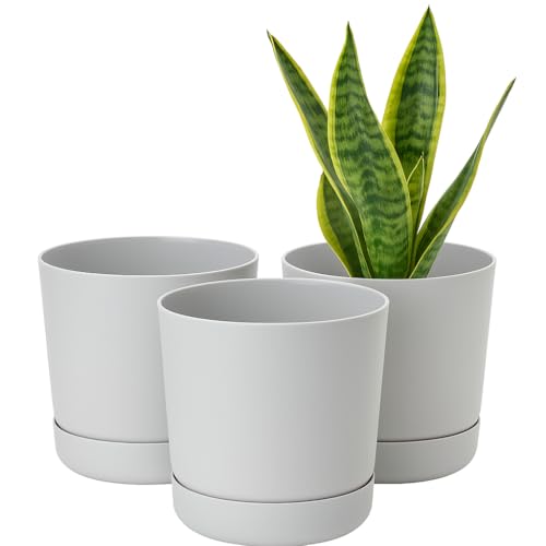 Home Garden Ornaments Plant Pots Indoor – Set of 3 Plastic Outdoor Planters with Drainage Holes and Saucer, Classy Decorative Flower Pots (15cm / 6inch – Grey)