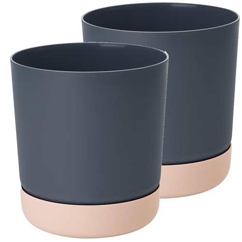 Home Garden Ornaments – Plant Pots Indoor, Set of 2 Plastic Outdoor Planters with Drainage & Saucer, Classy Flower Pots (13cm / 5.1 inch, Antracite/Pink)