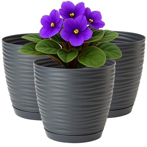 Home Garden Ornaments Wave Plant Pots Indoor, Set of 3 Indoor Plant Pot with 3D Effect, Drainage Holes, and Integrated Saucer, Plastic Flower Pots (Diameter: 19cm, Colour: Anthracite)