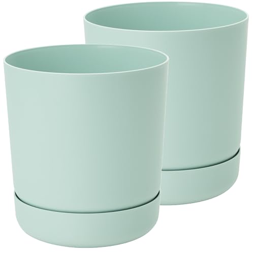 Home Garden Ornaments – Plant Pots Indoor, Set of 2 Plastic Outdoor Planters with Drainage & Saucer, Classy Flower Pots (17cm / 6.7 inch, Green)