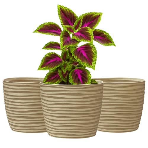 Home Garden Ornaments Large Wave Plant Pots Indoor, Set of 3 Indoor Plant Pot with 3D Effect, Drainage Holes, and Integrated Saucer, Plastic Flower Pots (Diameter: 23cm, Colour: Taupe)