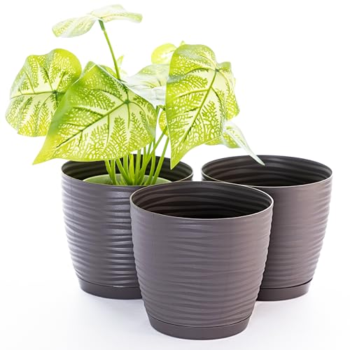 Home Garden Ornaments Wave Plant Pots Indoor, Set of 3 Indoor Plant Pot with 3D Effect, Drainage Holes, and Integrated Saucer, Plastic Flower Pots (Diameter: 17cm, Colour: Taupe)
