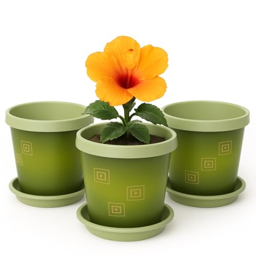 Home Garden Ornaments Plant Pots Indoor Outdoor Decorative Plastic Flower Pots with Saucer, Olive Green Pattern – Set of 3, Indoor Plant Pot (13 cm / 5.1 inch)