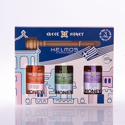 Helmos Greek Honey Gift Set – Collection of 3 Premium Honeys (Orange Blossom, Thyme & Forest, 3 x 120g) with Wooden Honey Dipper
