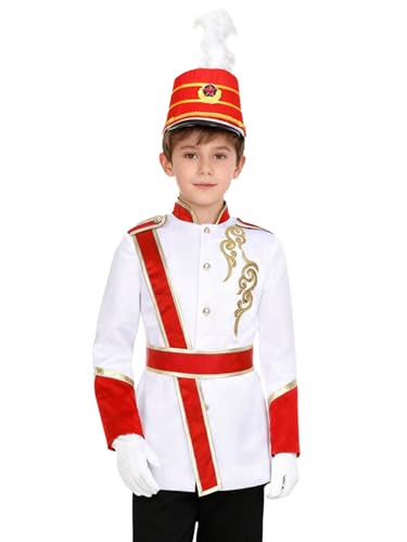 Manyakai Kids Royal Honor Guard Outfits Drummer Marching Band Costume Guard Jacket Coat with Soldier Hat Gloves Red White 5-6 Years