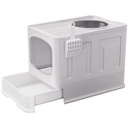Vivo Technologies Large Cat Litter Box Litter Tray, Foldable Litter Box with Lid, Scoop, Flap Door, Slide-Out Tray for Easy Cleaning, Large Anti-Splashing Hooded Space Cat Litter Tray