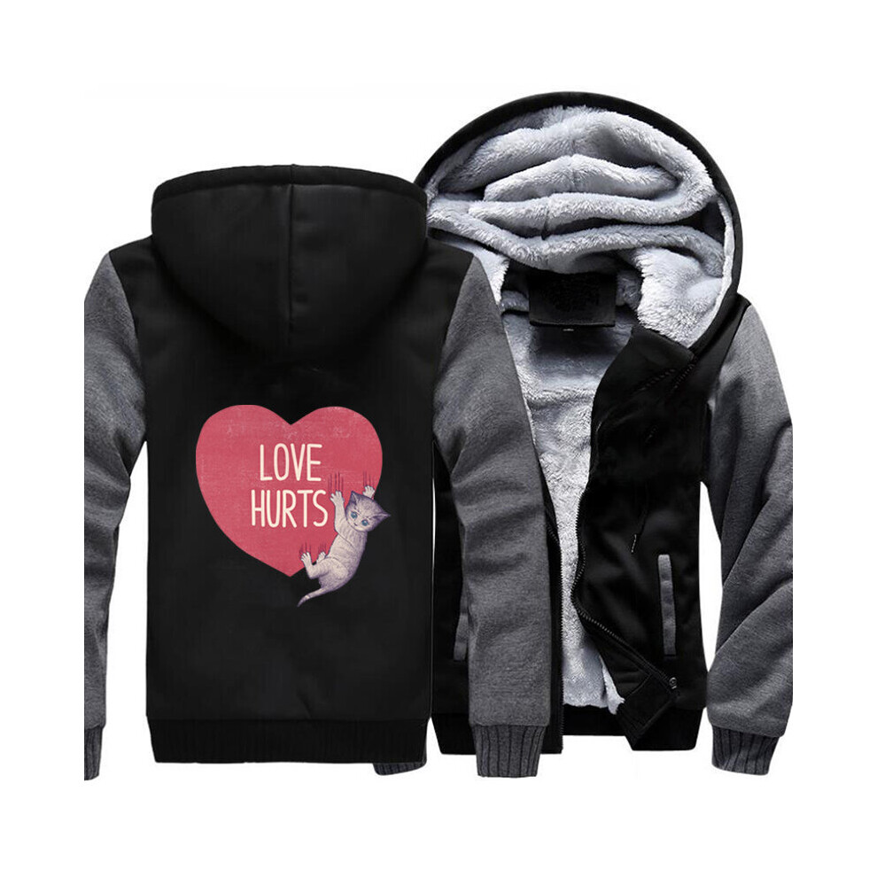 Love Hurts Cat Winter Jacket Men Fleece Thicken Hoodies Warm Hooded Jackets Camo Coats