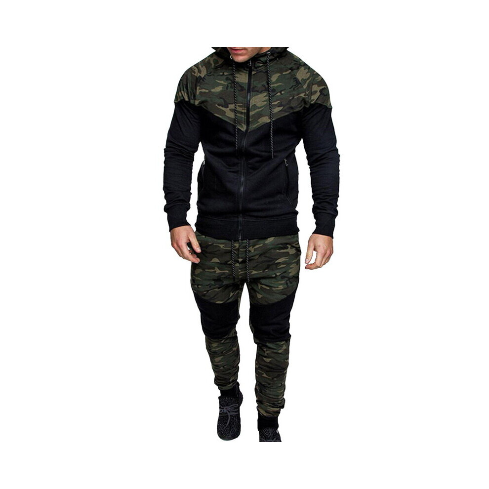 Men Causal Camouflage Patchwork Sets Camo Zipper Jacket+Pants 2Pc Tracksuit Sportwear Hoodies Sweatshirt Pant Suit