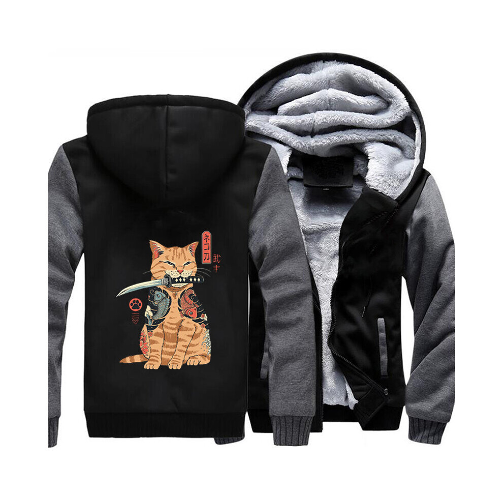 Samurai Cat Jacket Streetwear Men Winter Thicken Jackets Hooded Camo Hoodies Zip Up Hoodie Warm Fleece Sweatshirt Coats Clothing