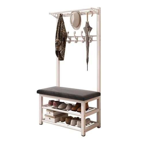 JAVPTAV Coat Rack with Shoe Bench and 14 Hooks Free Standing Metal Hall Tree with Shoe Racks 4 in 1 Design for Entryway Hallway Living Room Bedroom(White Gray,80cm)