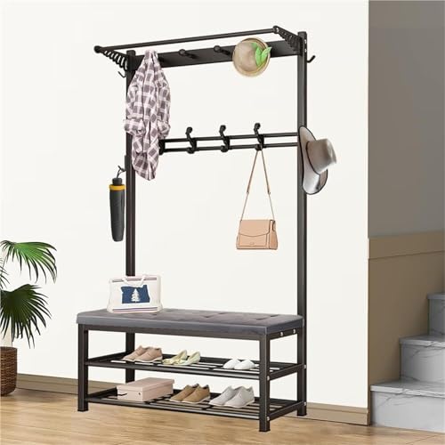JAVPTAV Coat Rack with Shoe Bench and 14 Hooks Free Standing Metal Hall Tree with Shoe Racks 4 in 1 Design for Entryway Hallway Living Room Bedroom(Black Gray,100cm)