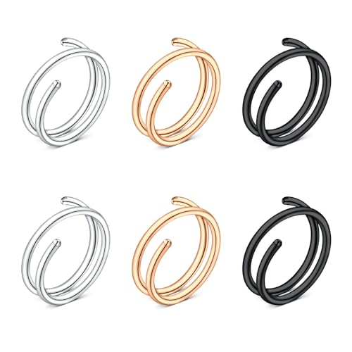 CIZME 6pcs Stainless Steel Double Nose Ring Bicyclic for Single Piercing 20G 8mm Silver Rose Gold Black Spiral Nose Hoop Nostril Piercing Jwewllery