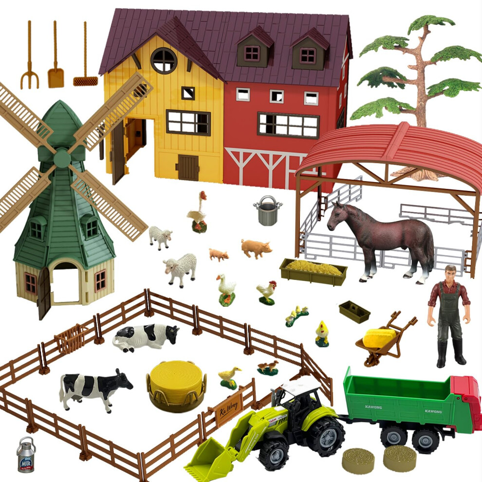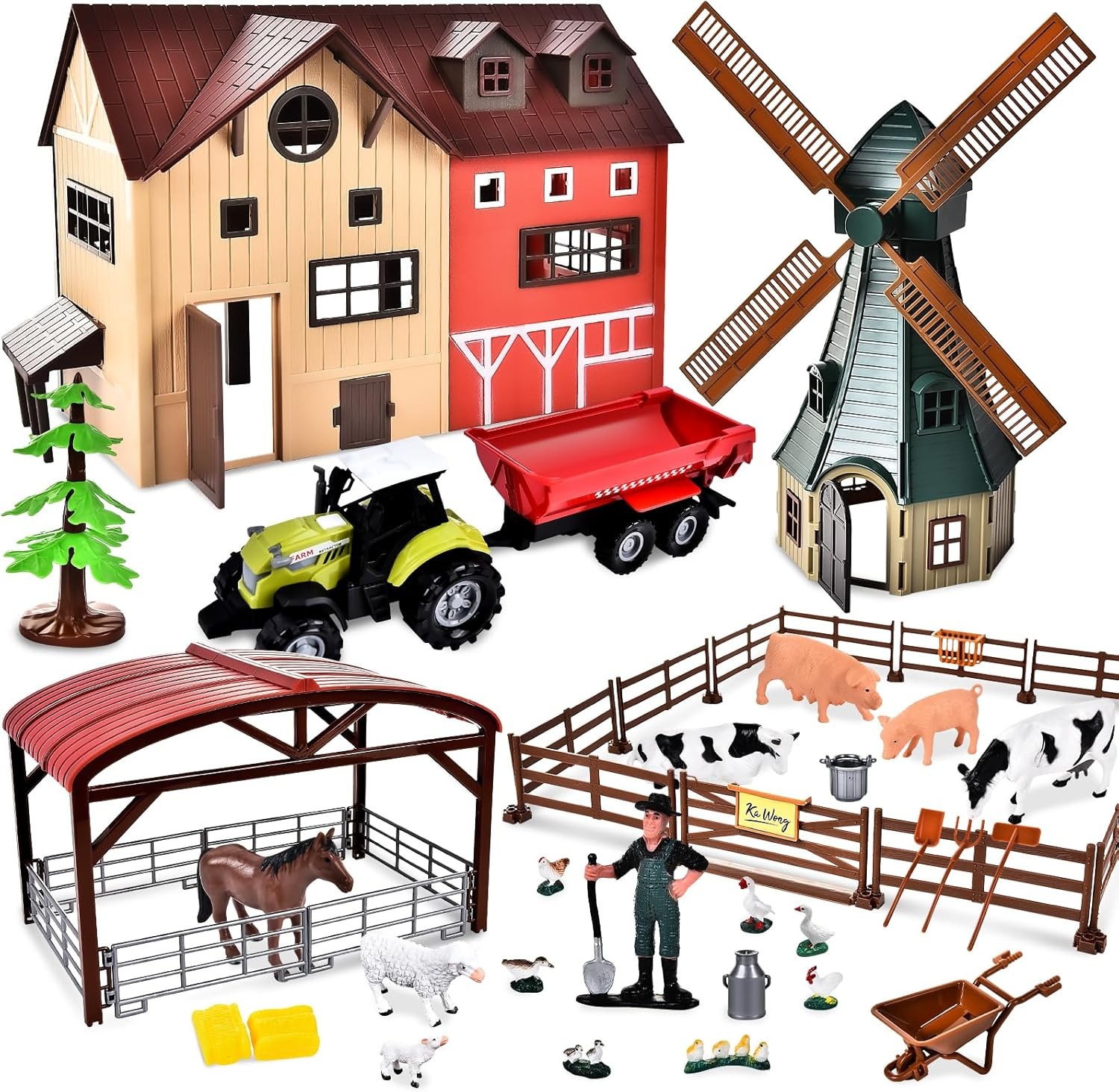 JONRRYIN Farm Animals Toys, Farm Toys with Windmill House Horse Stable Tractor Trailer Farmer Fence Cows, Farm Animal Playset, Farm Animal Figures Play Set Gifts for Kids Boys Children 3-7 Years Old