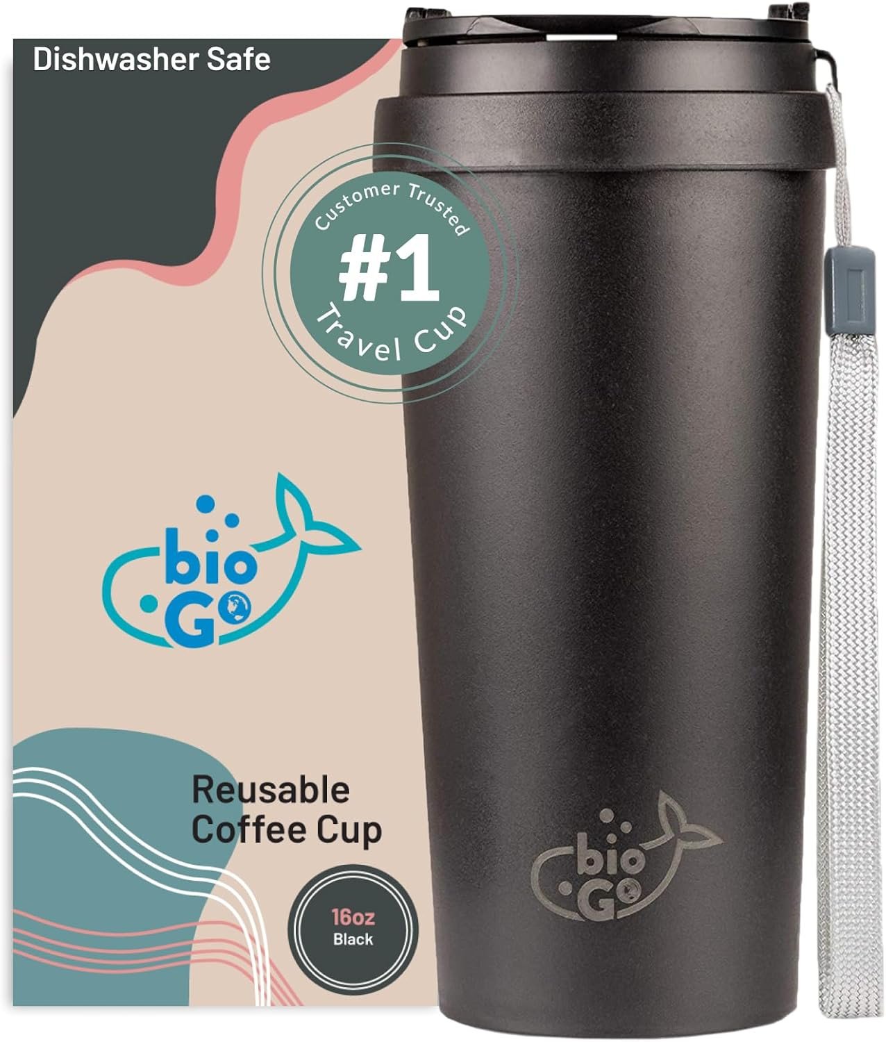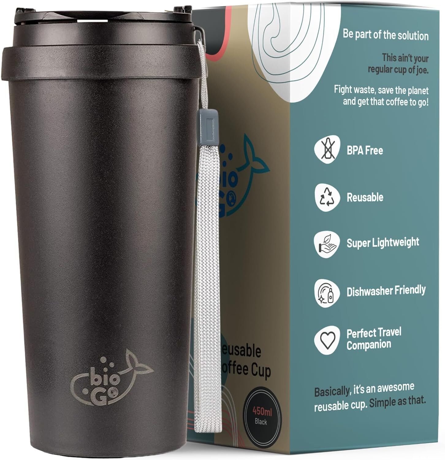 bioGo 450ml Midnight Black Travel Coffee Cup - Reusable Mug with Lid for Hot Dr