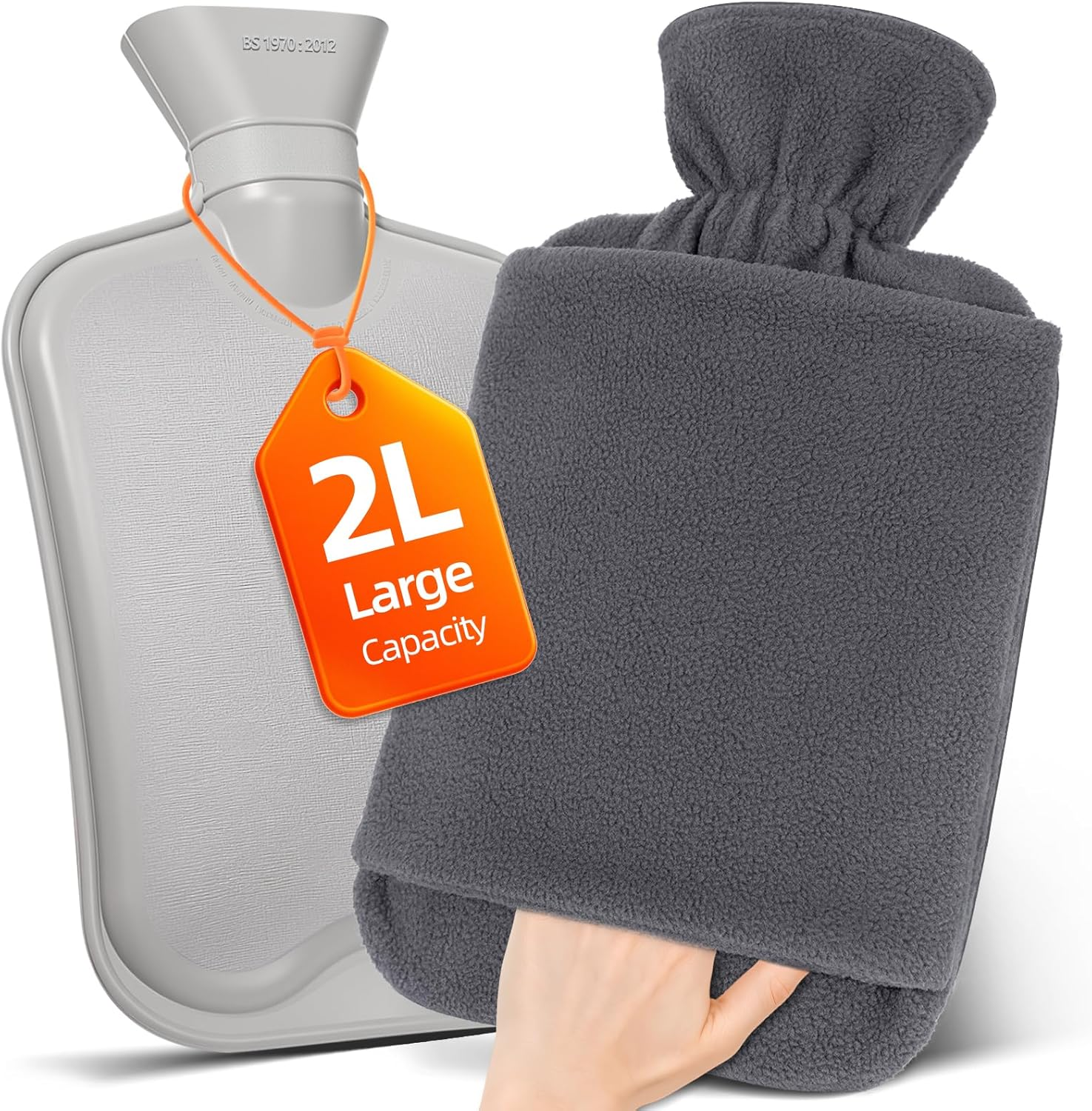 Large Hot Water Bottle with Cover - 2L Bag with Hand Pocket Warmer, Soft Fleece for Back, Neck, Shoulder and Period Pain Relief - Grey