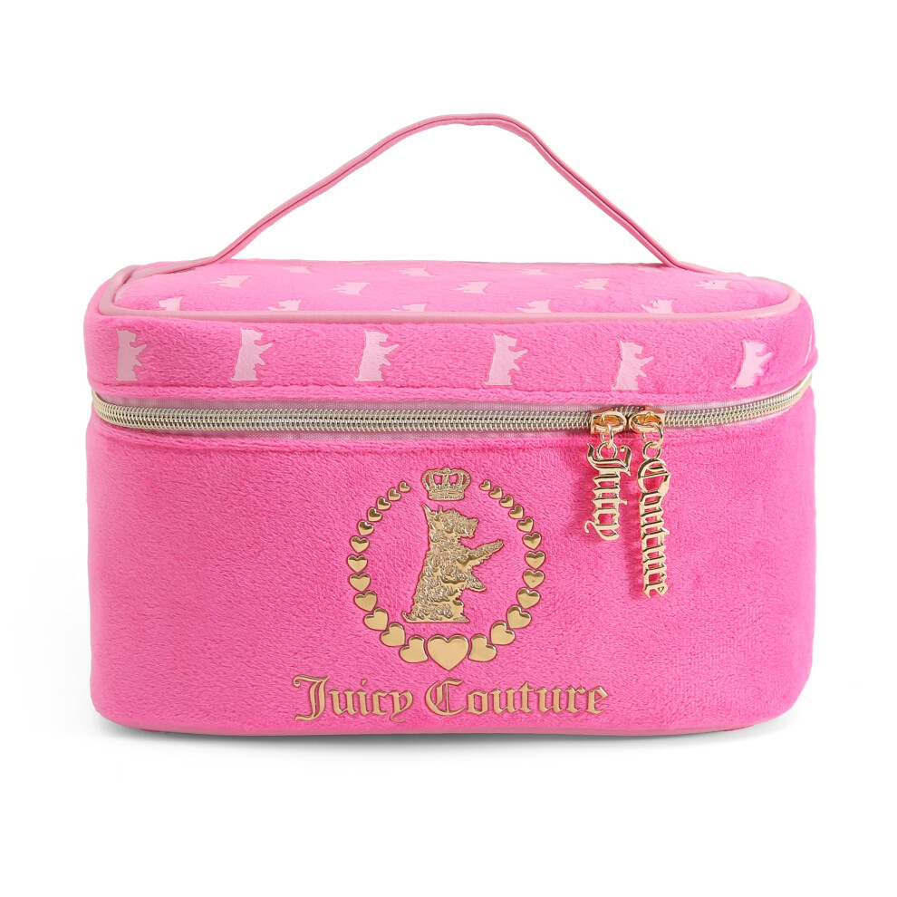 Juicy Couture Hot Pink Makeup Bag Cosmetics Organizer Travel Essentials Train Case Gold Terroir Dog Crown Velour