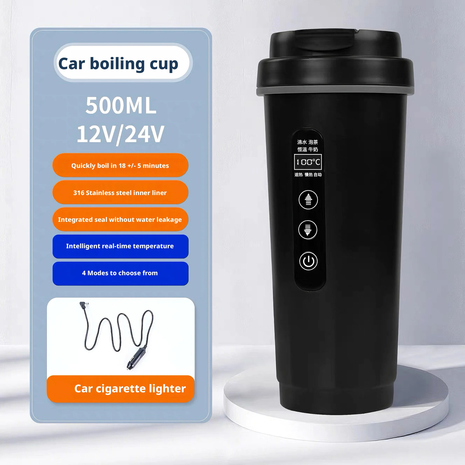 500ml Intelligent Screen Display Car Electric Kettle Car Electric Hot Water Mug Portable Car Heating Cup 12V 24V Black