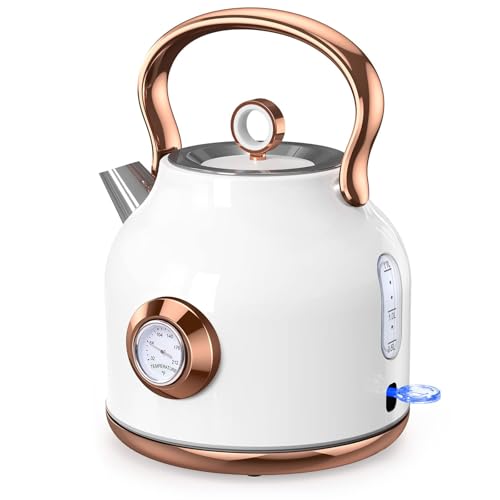 Retro Electric Kettle, 1.7L Stainless Steel Tea Kettle with Large Temperature Gauge, 1500W Fast Heating Hot Water Boiler with LED Indicator, Auto Shut-off & Boil-Dry Protection-Retro (White)