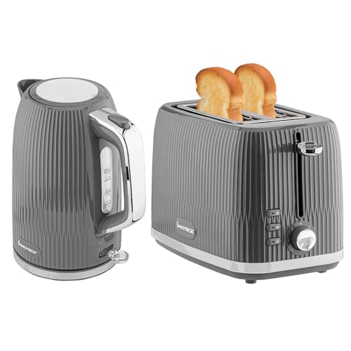 Innoteck Kitchen Pro 1.7L Electric Kettle & Toaster Set - Grey Ridged Textured & Stainless-Steel Body - Toaster with Defrost, Reheat & Cancel Functions - Hot Water Boiler with Auto Shut-Off Functions
