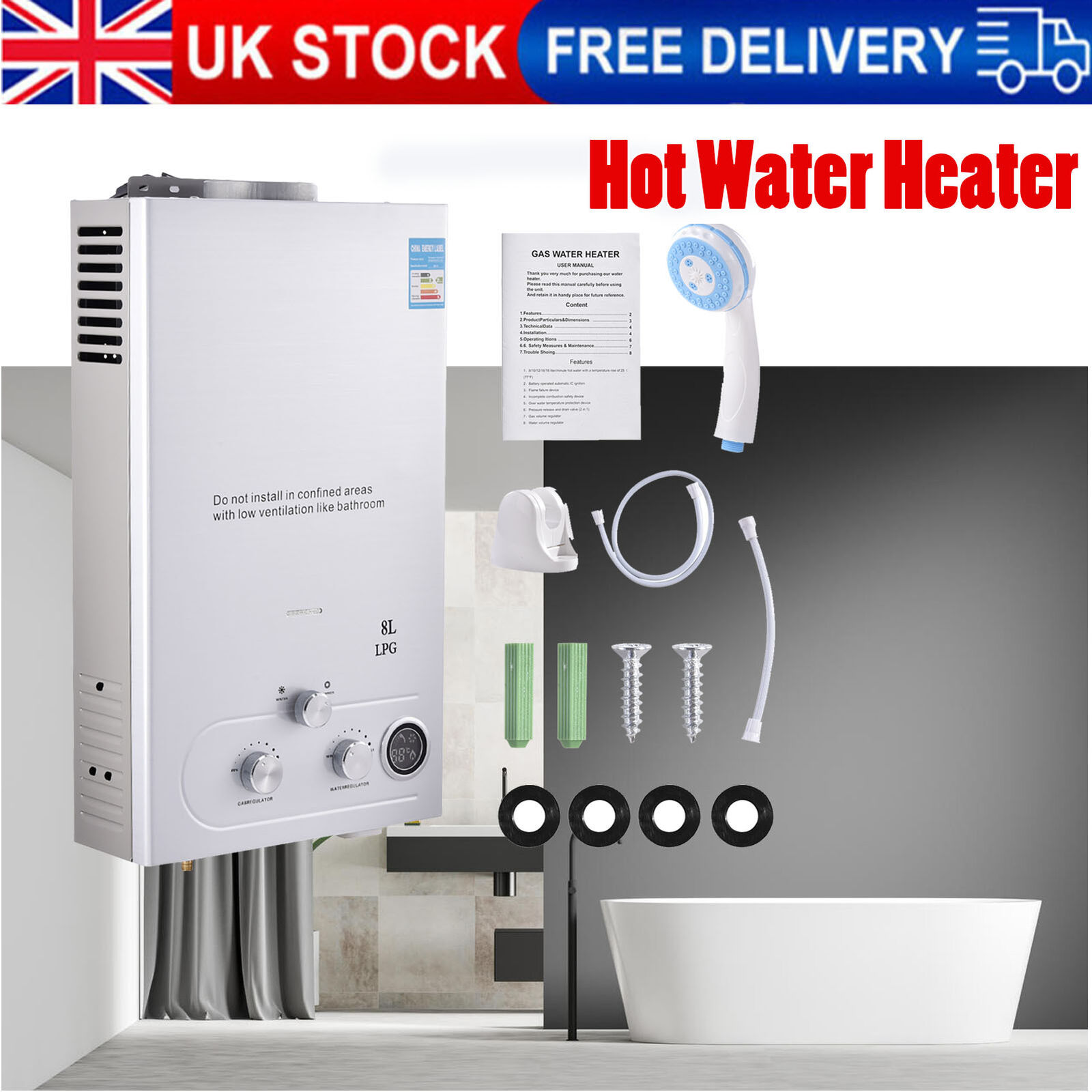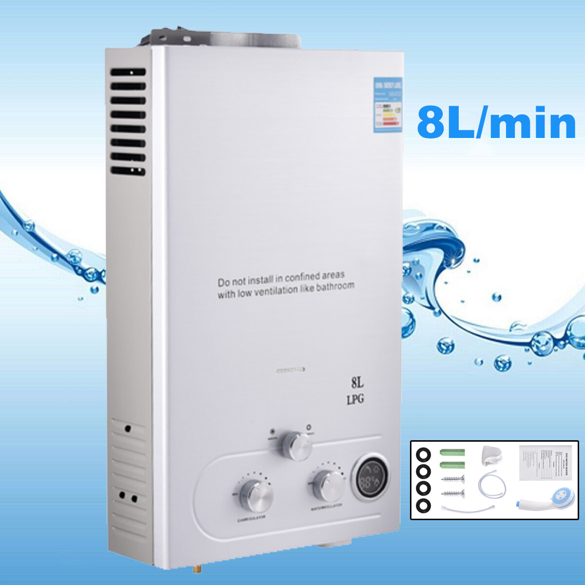 LPG Propane Gas Tankless Instant 8L Hot Water Heater Boiler With Shower Kit