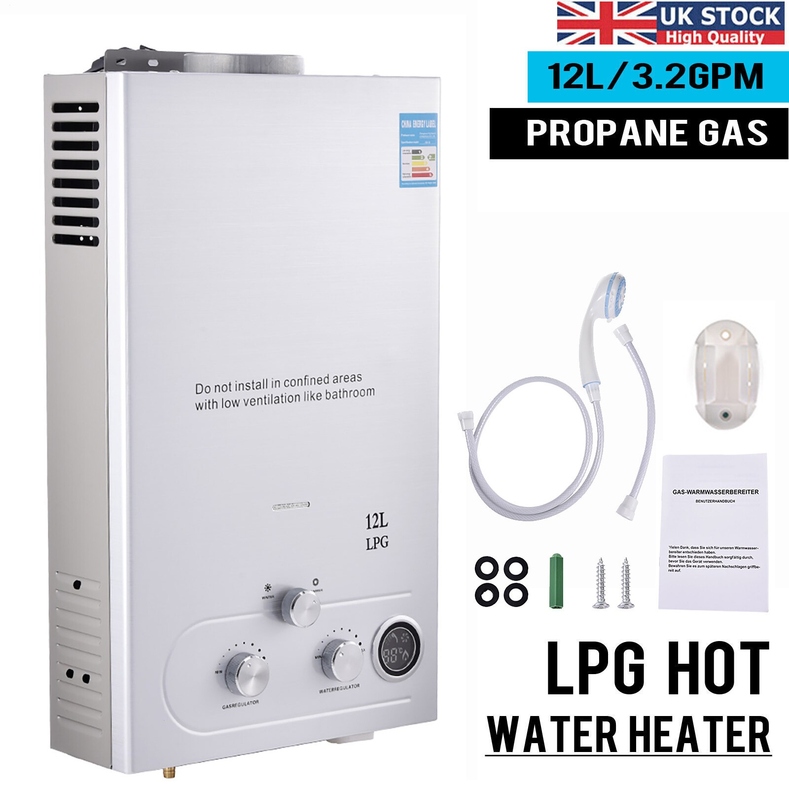 12L LPG Propane Gas Tankless Instant Hot Water Heater Boiler With Shower Kit UK