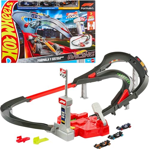 Hot Wheels Toy Car Track Set, 3 Formula 1 Die-Cast Vehicles in 1:64 Scale: McLaren F1 Team, Alpine & VCARB, Sprint Race Circuit (Teams May Vary), JDY15