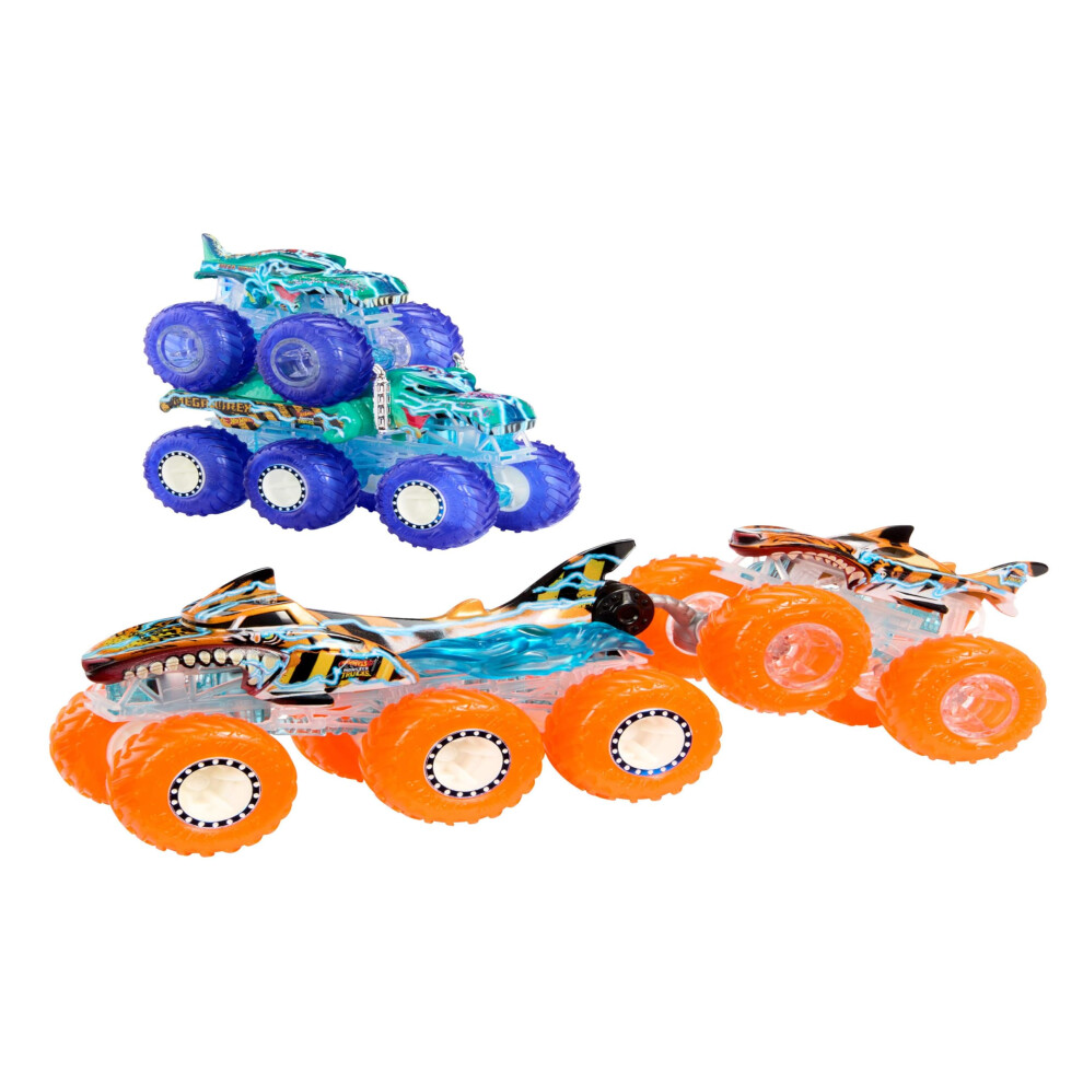 Hot Wheels Monster Trucks Multipack, 1:64 Scale Mega-Wrex & Tiger Shark Toy Trucks with Big Rigs in Matching Power Smashers Deco, HYJ29