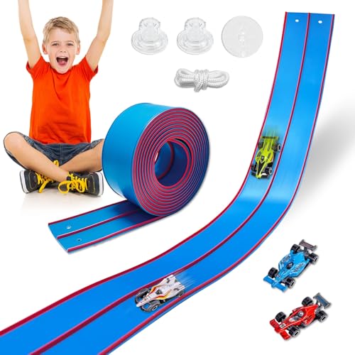 Flexible Race Track Toys for Kids 15 Ft with 4 Cars & Suction Cups, Portable Double Lane Racetrack Compatible with Hot Wheels & 1/64 Diecast Cars, Fun Car Ramp Track Set (Blue + Red, 15 Ft)