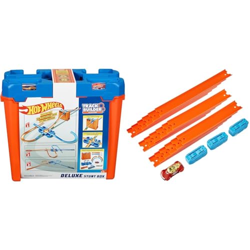 Hot Wheels Deluxe Stunt Box Giftable Set 15 Feet 36 Pieces Track Connectors and Curves, Ages 6 to 12 Years, GGP93 & BHT77 Straight Track Builder with Diecast and Mini Car Toy Pack [Amazon Exclusive]