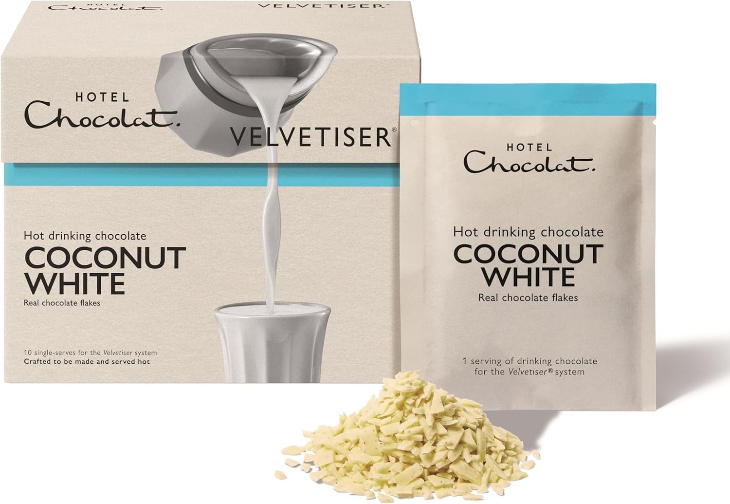 Hotel Chocolat Coconut-White Hot Chocolate Sachets - Luxury Chocolate Flakes - Pack of 10 Single-Serve Sachets, 310g - Suitable for Vegetarians
