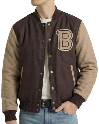 EASTIFIED Hotline Miami Varsity Letterman Brown Wool Letter B Patch Flight Bomber Jacket, Brown Wool, M