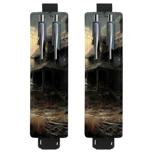 VAPOKF 2 Pieces Adjustable Elastic Band Pen Holder for Notebook, PU Leather Pencil Holder, Pen Sleeve Pouch for Hardcover Journals, Books, Planners, Binders, Tablets - Raven Abandoned House Dead Tree