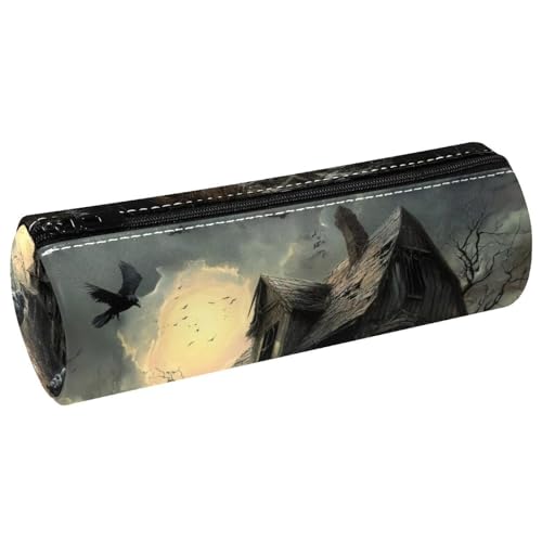 VAPOKF Raven Abandoned House Dead Tree Leather Barrel Pen Pencil Case Coin Purse Cosmetic Makeup Bag for Student Stationery School Office Storage