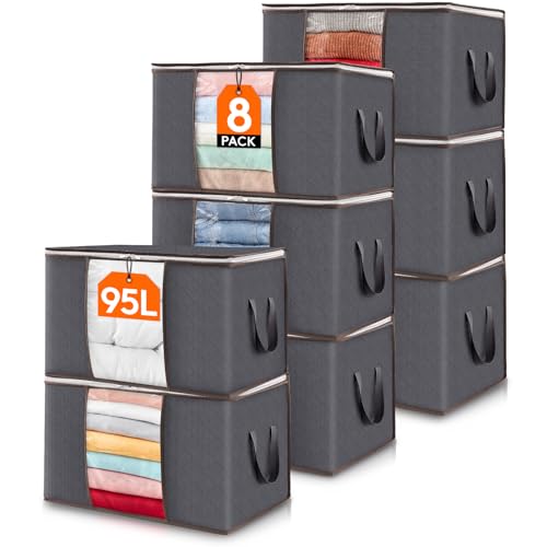 Lifewit 95L Clothes Storage Bags Large Storage Box With Lid Packing Boxes for Moving House With Reinforced Handle Thick Fabric Clear Window for Clothes Duvet Blankets Bedding, 8 Pack, Grey
