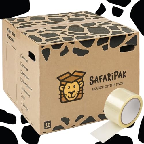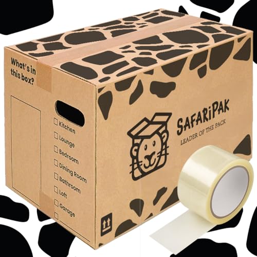 SAFARIPAK - 10 Pack Strong Large Reusable Cardboard Storage Packing Moving House Boxes 52cm x 30cm x 30cm with Carry Handles and Room List Checkboxes - 47 Litres Capacity - Inc. 66m Roll of Tape