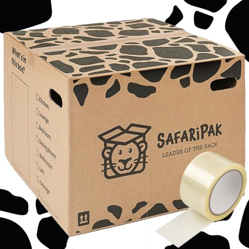 SAFARIPAK - 20 Pack Strong Large Reusable Cardboard Storage Packing Moving House Boxes 52cm x 30cm x 30cm with Carry Handles and Room List Checkboxes - 47 Litres Capacity - Inc. 66m Roll of Tape