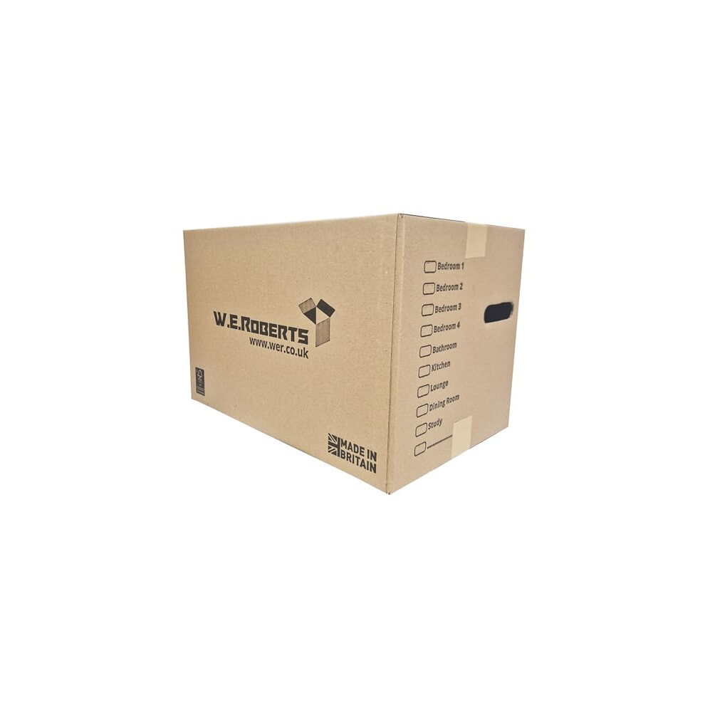 W.E. Roberts 40 Large Strong Cardboard House Moving Boxes with Carry Handles and Room List, Removal Packing boxes Boxes for moving house 45.7cm x 28.8cm x 28.8cm with 66 Metre Low Noise Clear Tape