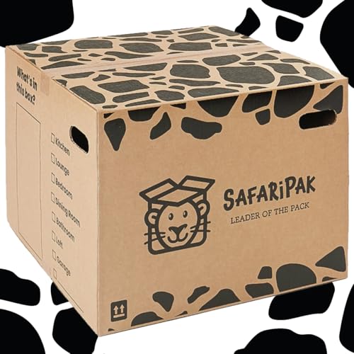 SAFARIPAK - 5 Pack Strong Large Reusable Cardboard Storage Packing Moving House Boxes 52cm x 30cm x 30cm with Carry Handles and Room List Checkboxes - 47 Litres Capacity