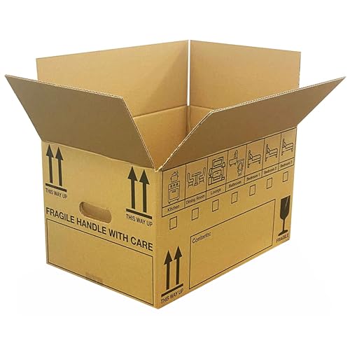 10 Strong Large Cardboard Storage Packing Moving House Boxes with Fragile Tape 52cm x 30cm x 30cm 47 Litres Carry Handles and Room List