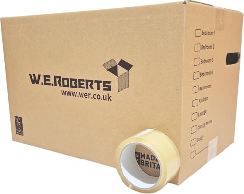 W.E. Roberts 10 Large Strong Cardboard House Moving Boxes with Carry Handles and Room List, Removal Packing boxes Boxes for moving house 45.7cm x 28.8cm x 28.8cm with 66 Metre Low Noise Clear Tape
