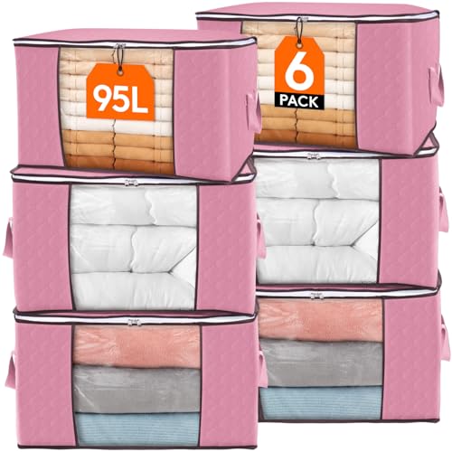 Lifewit 95L Clothes Storage Bags Large Storage Box With Lid Packing Boxes for Moving House With Reinforced Handle Thick Fabric Clear Window for Clothes Duvet Blankets Bedding, 6 Pack, Pink