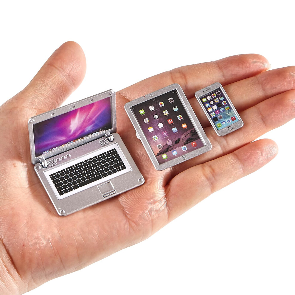 3 Pcs Dollhouse Furniture Accessories Miniature 1:12 Scale Simulation Metal Laptop Tablet Smart Phone Stuff Doll House Mini Play Set Accessories (Whi