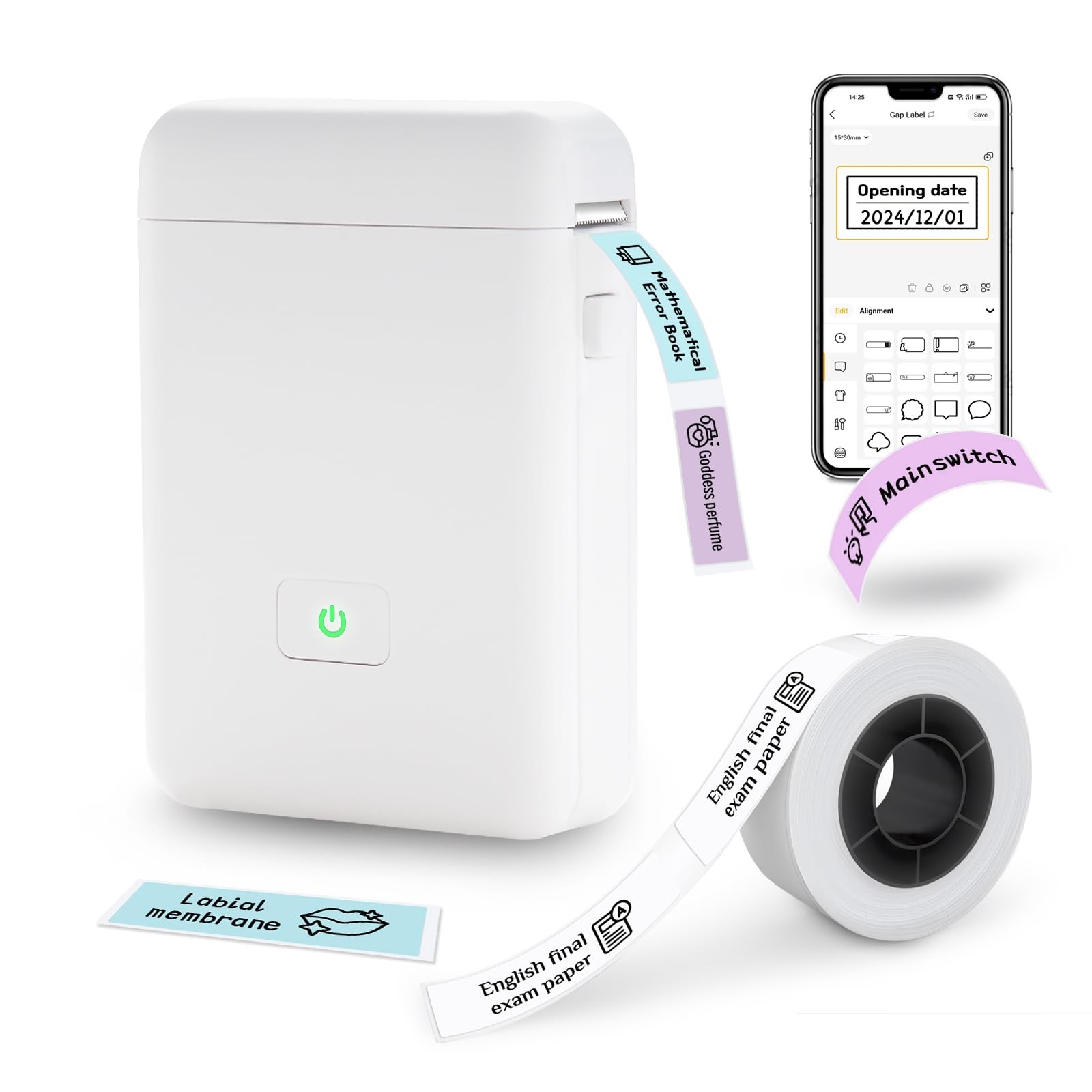 Bluetooth Label Maker Machine with Tape(14*40mm), HP2-S Portbale Label Thermal Printer, Inkless & Rechargeable, Mini Sticker Printer with Multiple Templates for Organizing Storage Office Home, White
