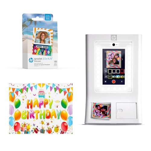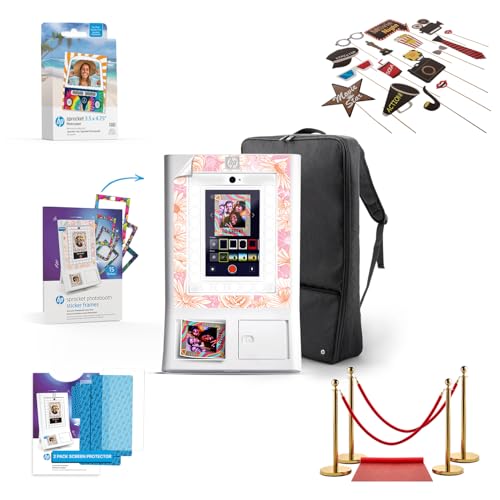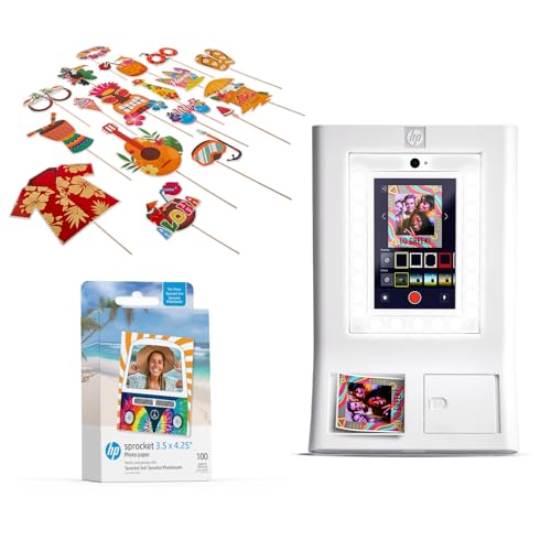 HP Sprocket Photo Booth Machine Instant Color Photo Printer - 10.1" Touchscreen, LED Ring Light - Customize w/250+ Fun Frames, Prints on 3x4 Zink Paper or Share via QR Code, Mobile Notify App - White