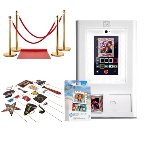 HP Sprocket Photo Booth Machine Instant Color Photo Printer (White) + Zink Paper (100 Sheets) + Red Carpet (1)+ Hollywood Props (1)
