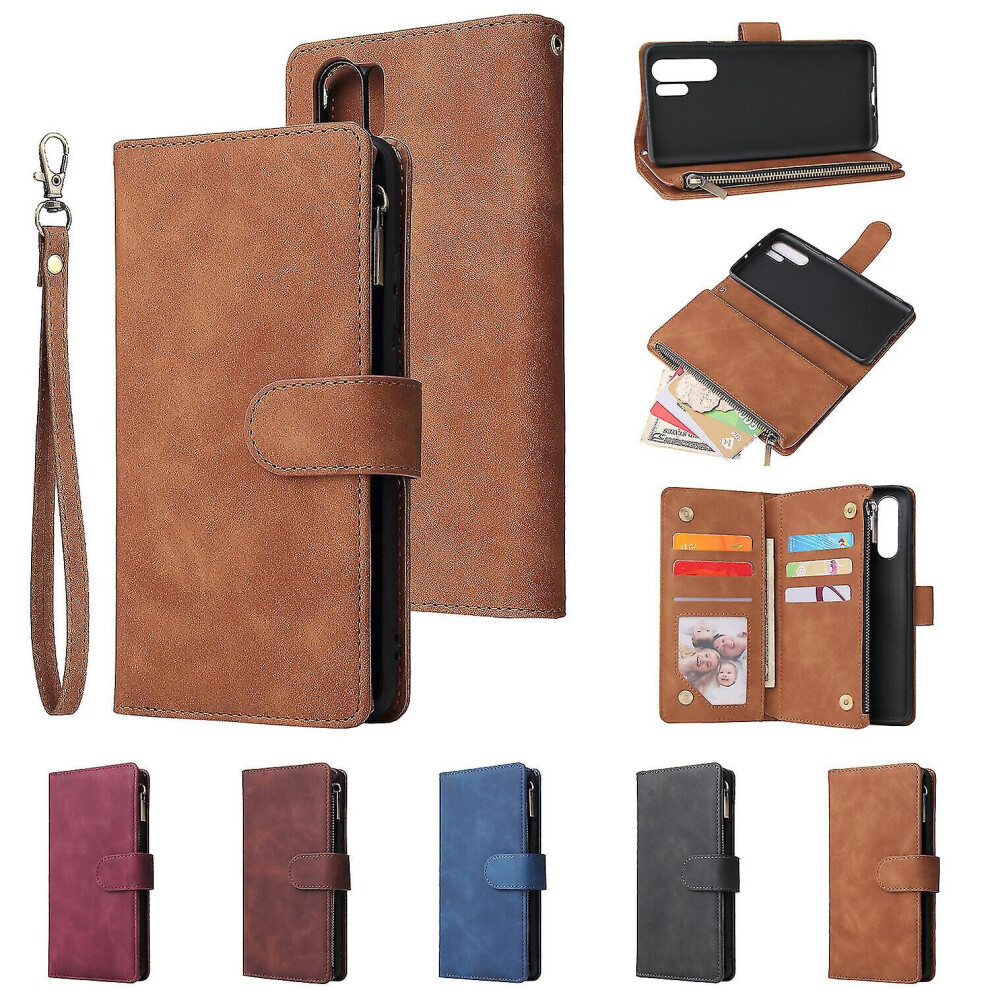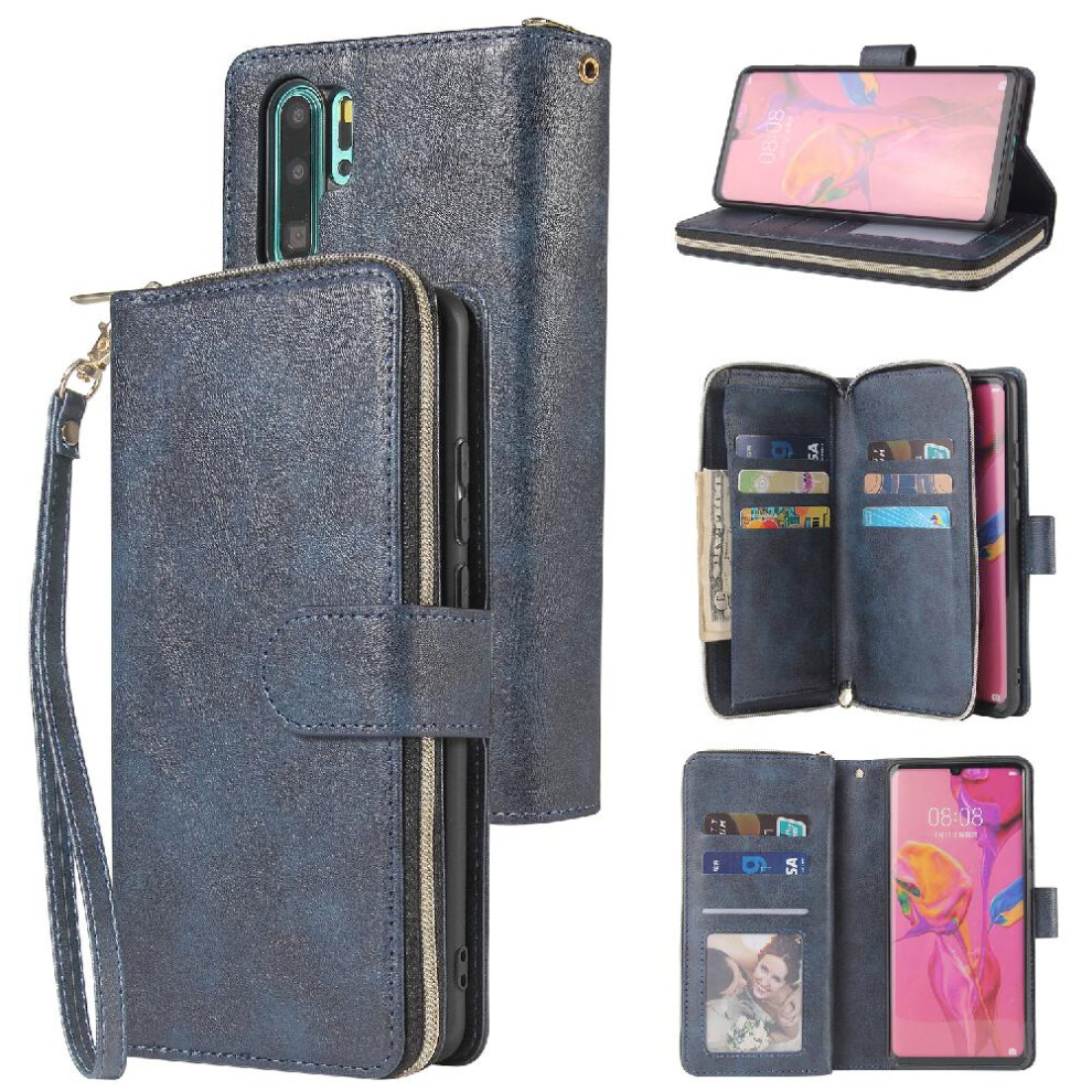 (Blue) Case For Huawei P30 Pro Wallet Case With 9 Card Slots Flip Cover Card Holder Zipper Pocket With Hand Strap