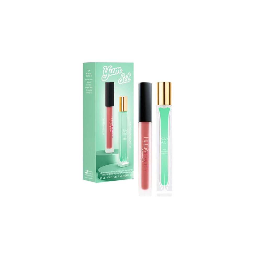 Huda Beauty Kayali Yum Gift Set - Pistachio Gelato | 33 Eau De Parfum Travel Size Spray (0.34 fl oz / 10 ml) and Matte Liquid Lipstick in Shade Queen