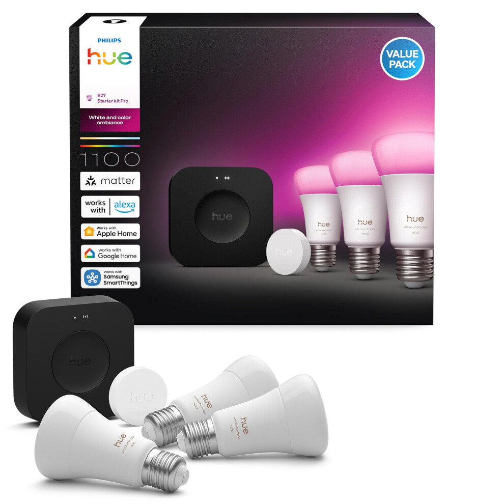 Philips Hue Starter Kit: Bridge Pro + 3 E27 Smart Bulbs + Smart Button, White and Color ambiance, Smart Light Hub, Works with Alexa, Google Assistant, Samsung SmartThings, Apple Home